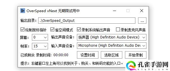 7、OverSpeed《OverSpeed》是一款轻量级但是高品质的录屏软件,由个人开发制作。在同类软件中的体积最小的,整个程序只有几MB,单文件非常绿色。使用本软件录制几手不会损失画音质,画质几乎超越市面上的所有录像软件,会保证画质无损的情况下进行优化,理论最大录制分辨率为4k,帧率最高120。