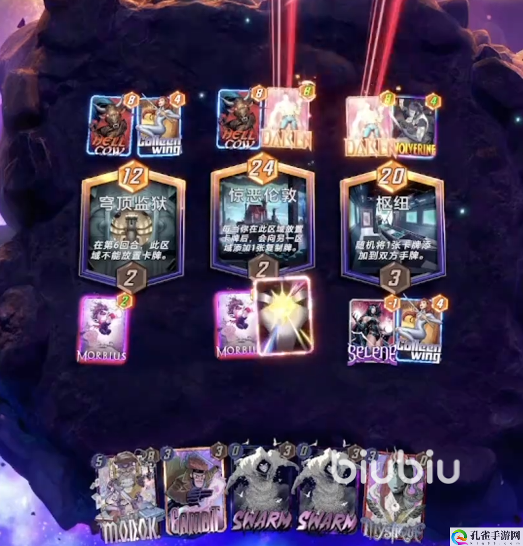 莫比亚斯和米克的效果是差不多的,但是他不能移动,相应的每丢一张牌他会增加两点战力,这两个卡牌可以放在同一个半区来巩固胜利,或者一边一个来争取更多的优势,要注意的是他的效果和米克的效果区别是他是持续效果而米克是自带的,所以如果遇到能让持续效果无效化的卡牌要注意留有后手。