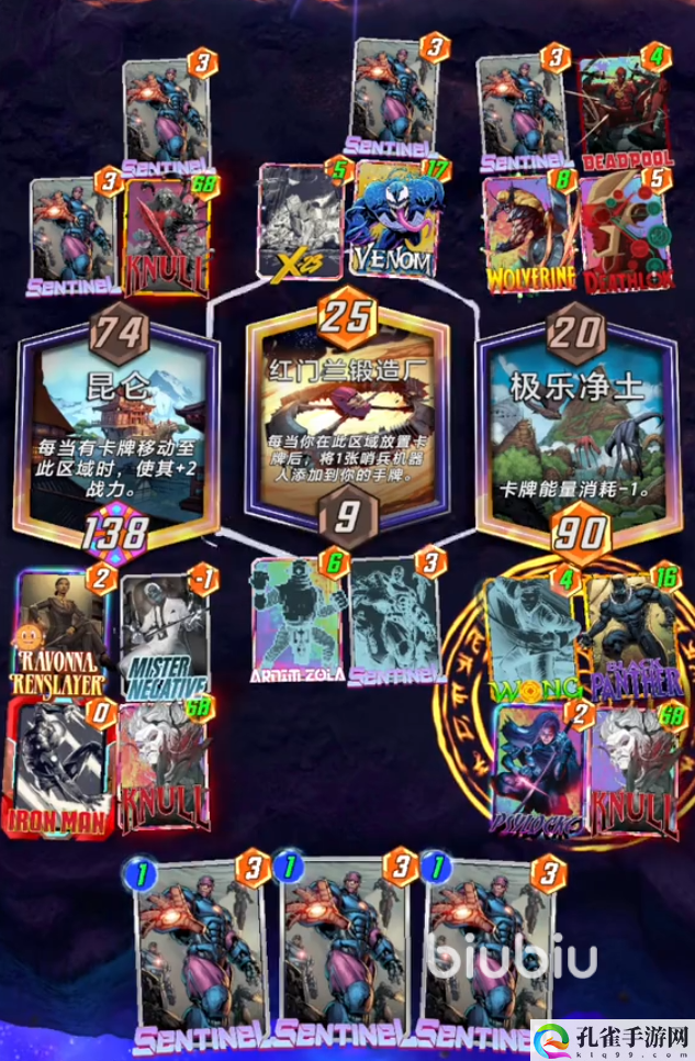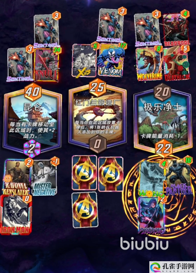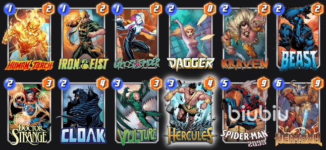 这三个角色是非常契合赫拉克勒斯的,前两个的效果都是只要有一次移动,就会增加一次战力,秃鹫是每移动一次增加6点,而霹雳火则是移动一次就翻倍,而只要把他们移动到赫拉克勒斯的范围里面,他们就会再有一次额外的移动,这样相当于一回合就增加了两次战力值,能极大的威胁敌方的各个区域,而蜘蛛侠则是在首次移动的时候会摧毁敌方区域的一张卡,赫拉克勒斯也能帮他多造成几次摧毁。