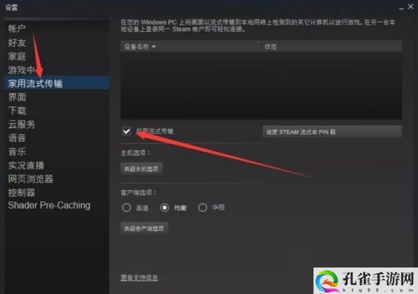 选择“家用流式传输”→启用流式传输