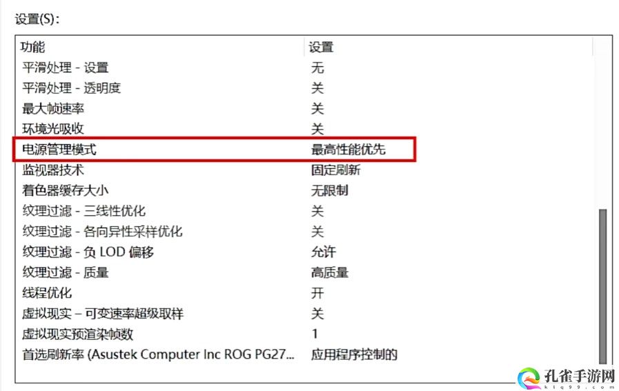 其他的多项也都设置成关闭,然后是电源管理模式选择以“最高性能优先”,监视器技术选择“固定刷新”,着色器缓存大小设置成无限制,纹理过滤质量选择高质量,这个如果设置得太低的话,画面会出现许多马赛克。