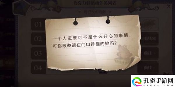 哈利波特魔法觉醒中巧克力蛙的任务总是会给大家一条线索来帮助大家来寻找,这次的线索是一个人进餐可不是什么开心的事情,那么这一位npc在哪里了?一起来看看吧。