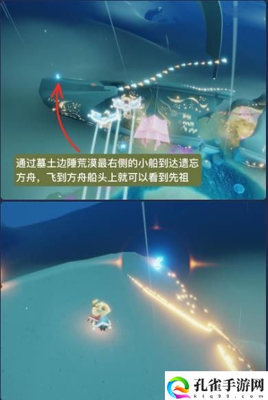 点头先祖位于墓土边陲荒漠,最右侧的小船可以到达遗忘方舟,飞到方舟的船头就可以看到先祖。