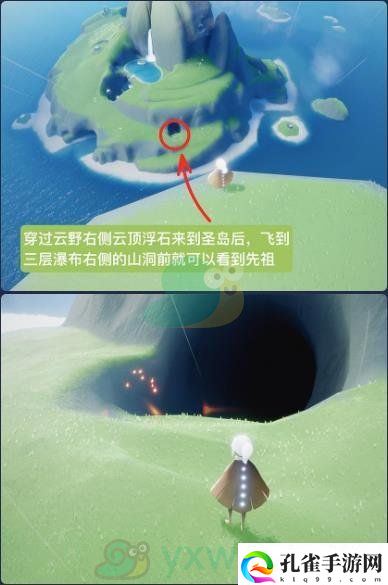穿过云野右侧云顶浮石来到圣岛后,飞到三层瀑布右侧的山洞前就可以看到先祖