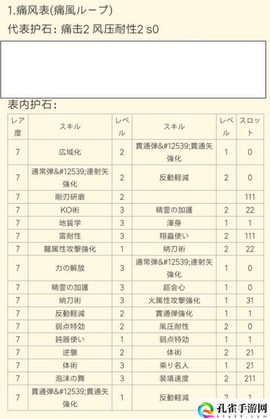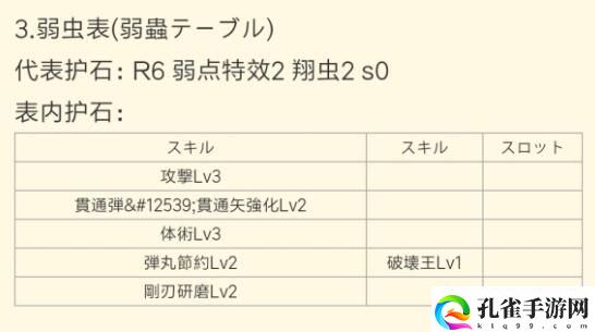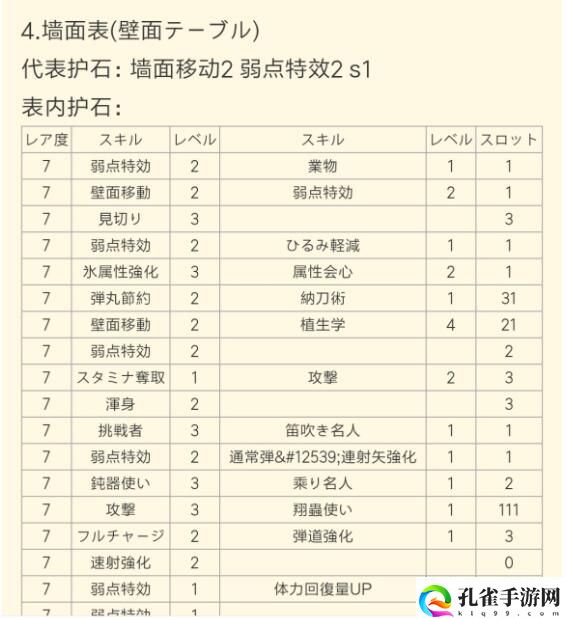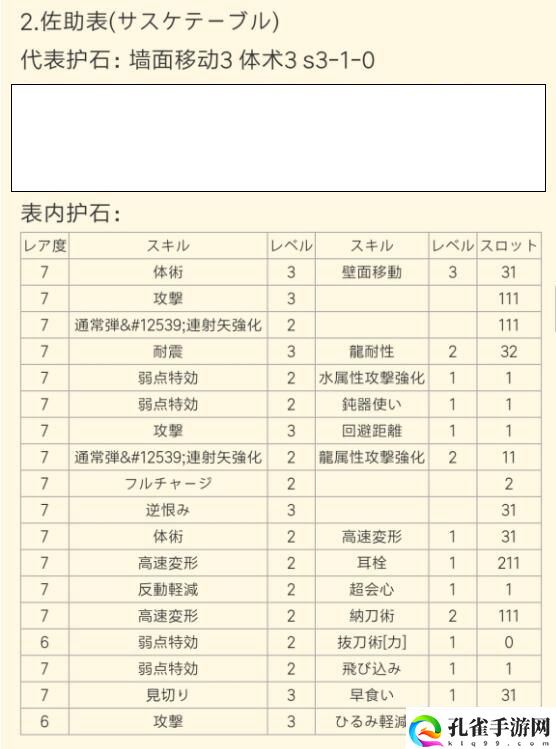 要点3:要合理组合优秀的B类C类技能(耳塞、回避性能和距离、翔虫使、高速变形、逆袭、纳刀、拔刀术力、钝器、体术、道具使用强化)都价值2孔以上,而且能让护石孔位变成3-2-1最大化护石价值。
