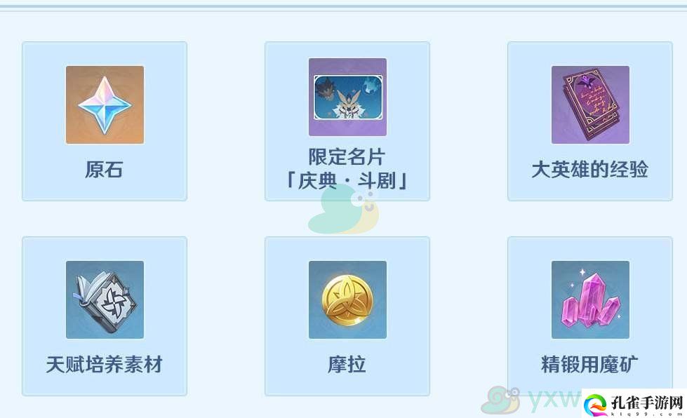 2、活动奖励有原石、限定名片庆典斗剧、大英雄经验、天赋培养素材、精锻用魔矿、摩拉等。