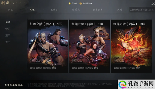 首先第一个方法就是主线任务,完成主线任务能获取一批普通和上级装备,穿戴好这些装备,就可以开启进行普通难度的红莲之陵副本挑战,这个副本也就是我们获取稀有武器和装备的重要来源。