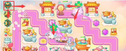 3、有金币在上方放置风扇,左上角放置多重箭,把附近障碍物清理,空出的位置放置风扇和多重箭。