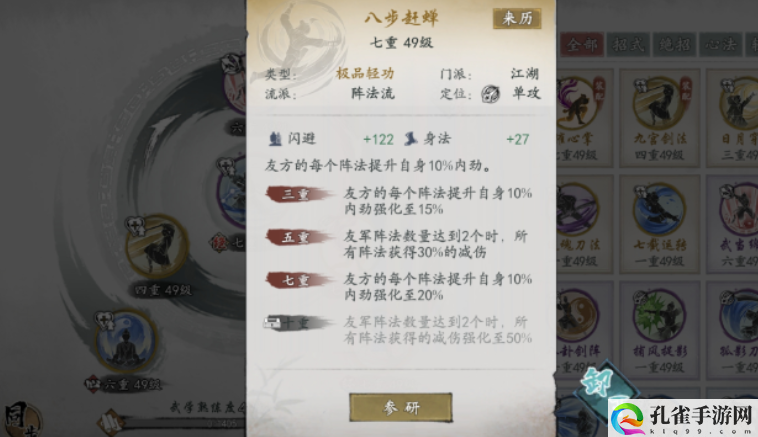 在心法和轻功的选择上,点星决与重阳功是非常推荐的搭配,能够有效增强武当阵法流的整体输出与生存能力。而在轻功方面,八步赶蝉则提供了灵活的移动与生存能力,使得武当阵法流不仅在进攻上极具压迫力,还能保持较好的机动性。此外,必带的随从是芊芊,她所携带的八卦剑阵可以进一步增强团队的战斗能力,为整个阵法流派提供额外的辅助效果。