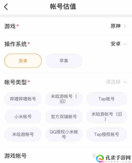 大家在针对原神这款游戏进行账号价格评估的时候,除了传统的人工对比价格外,也可通过本站的免费估值服务来帮助自己,在里面大家只需去根据提示来选择对应的游戏即可,虽然目前支持的游戏不多,但是原神恰好就是其中之一,支持的账号类型和操作系统也很全面,大家根据需要去点击,然后把对应的截图上传,等待片刻后就能获得准确的报价了。