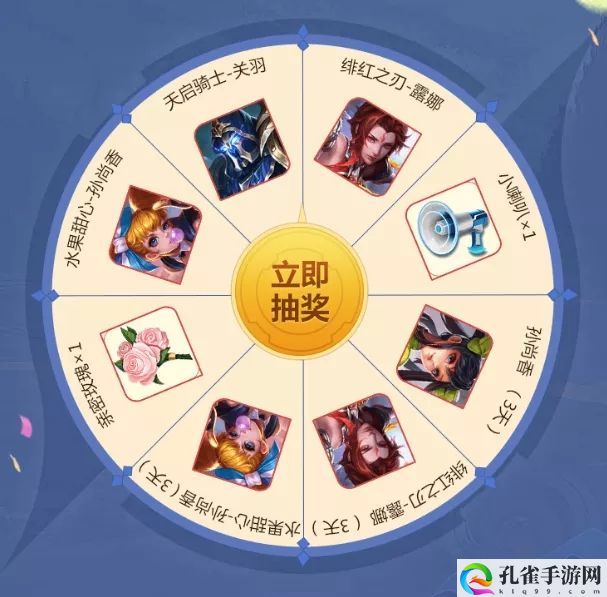 5月20日前每天登录,都有一次抽奖机会,露娜-绯红之刃、孙尚香-水果甜心、关羽-天启骑士等好礼免费抽!